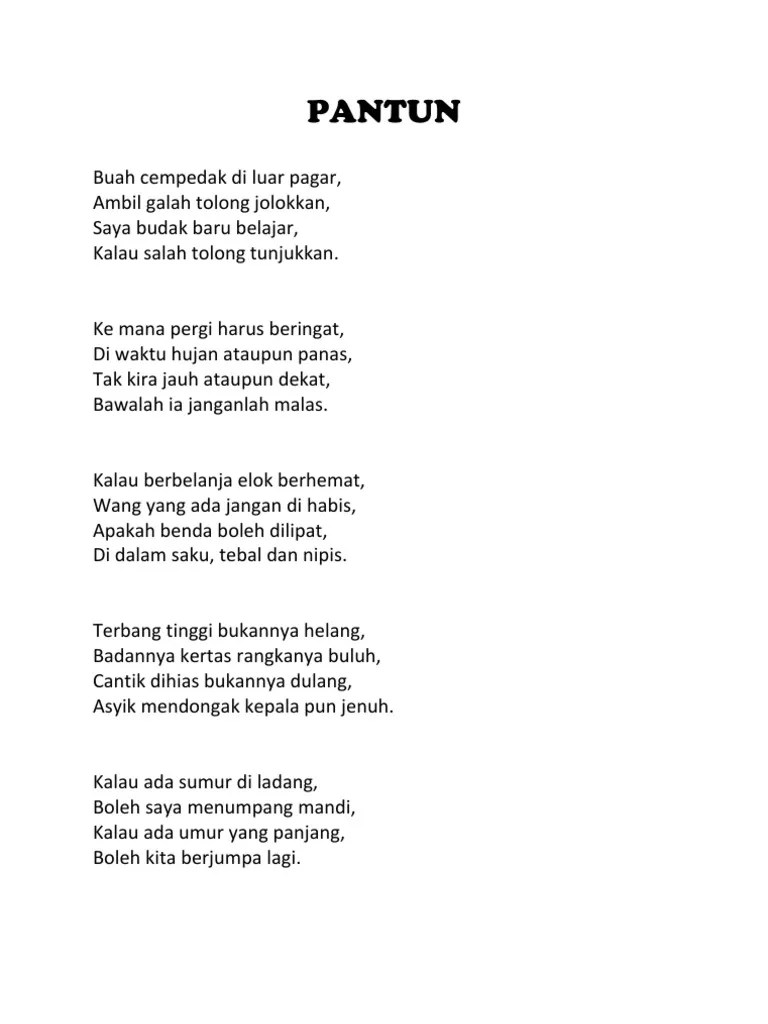 Pantunbahasa melayupuisi melayu merupakan susunankata yang mengandungi bahasa kiasan, sindiran halus,nasihat dan pengajaran. Maksudnya dalam dua bait terakhir, mengambil contoh pantun lama 4 kerat tadi lah. Kalau ada sumur di ladang, Buah cempedak di luar pagar, ambil galah tolong jolokkan;